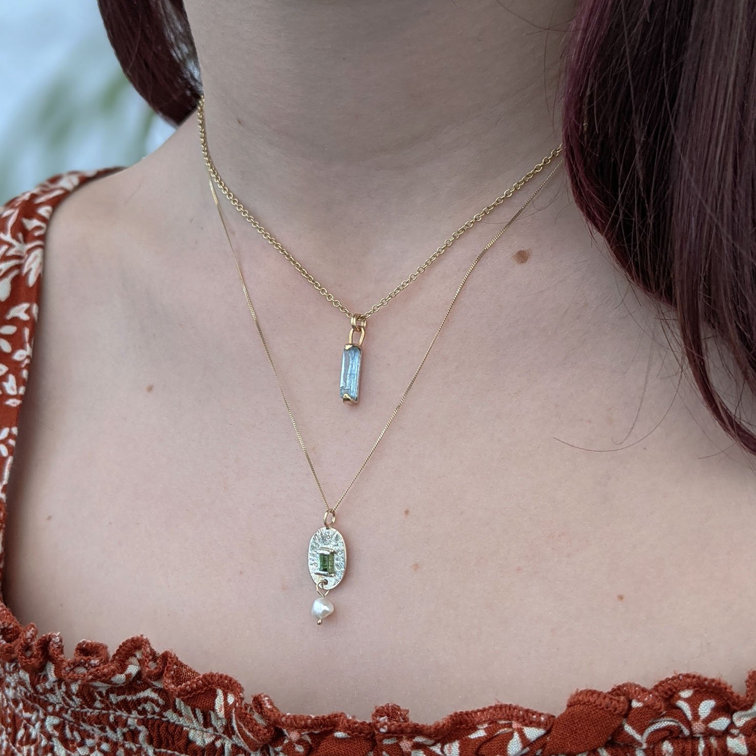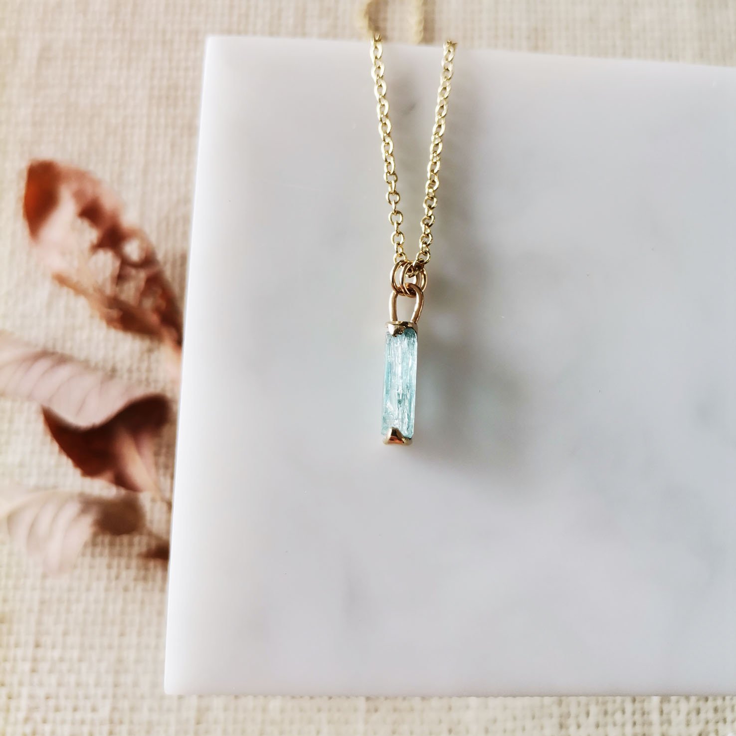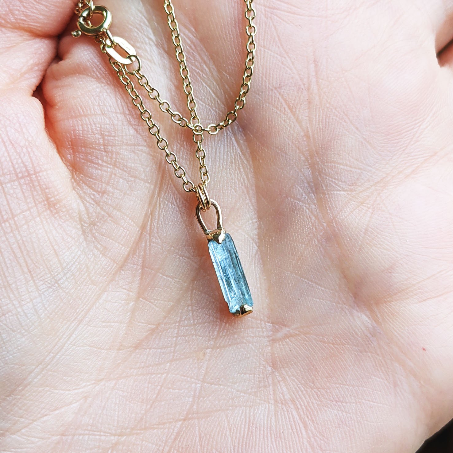This stunning blue tourmaline crystal is set in gold and silver and hangs on a 9ct gold chain.