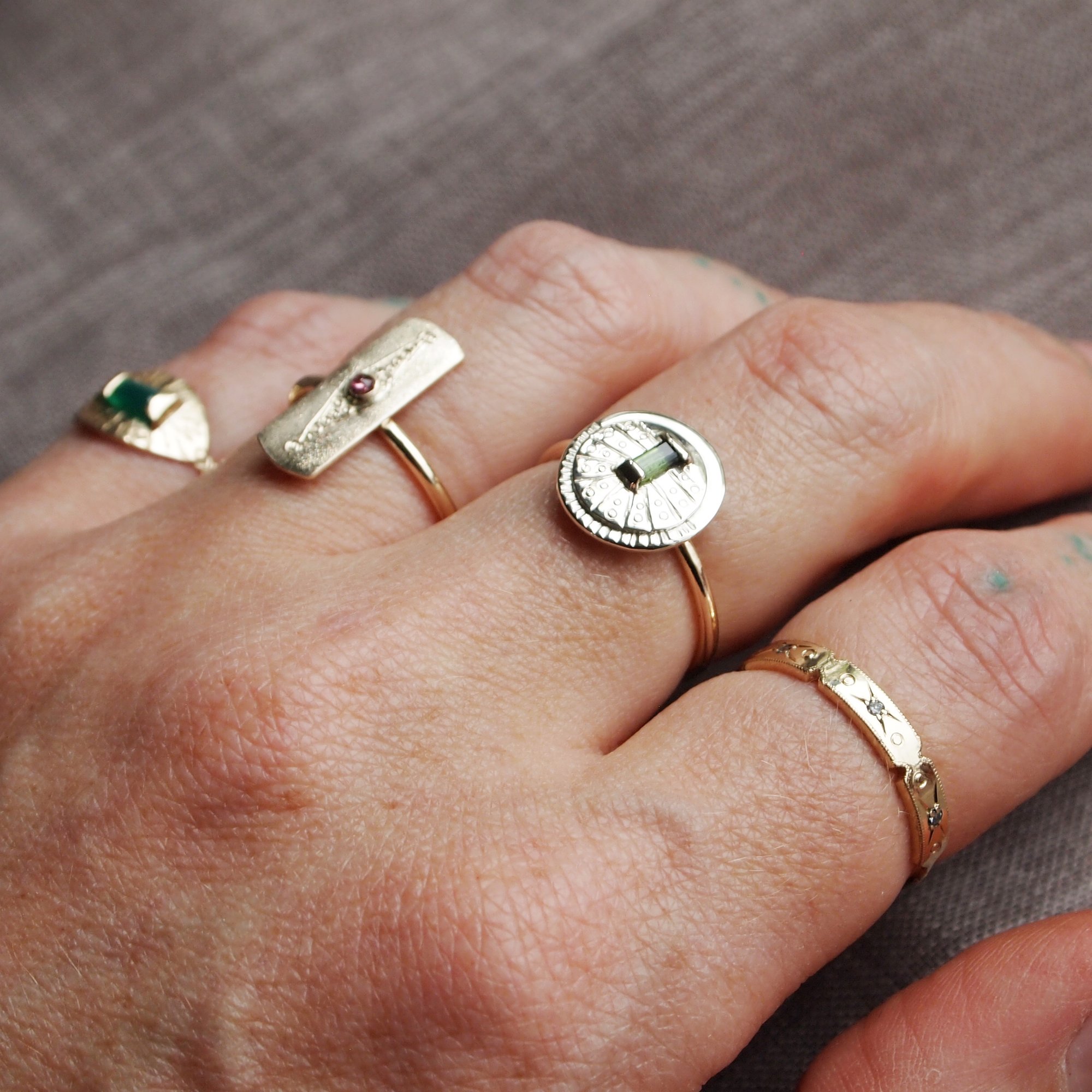 The Orbit Ring is made from 9ct eco gold and is hand made in Dundee. It has the most beautiful green tourmaline gem stone that radiates creative energy, attracting luck, success and prosperity.