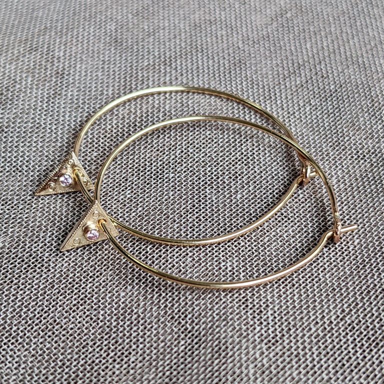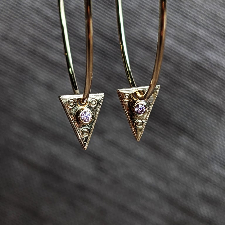 9 ct Eco gold hoops with two stunning tourmaline gem stones. Bezel set, hand engraved with a fine milled edge.