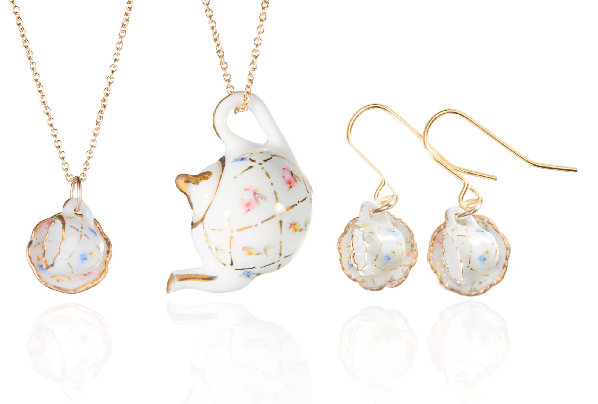 a tiny ceramic tea pot with a lovely gold latice design and a gold plated chain.