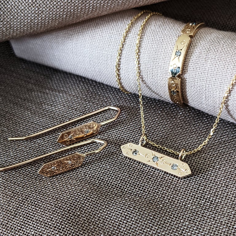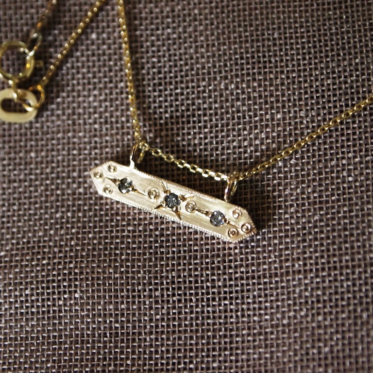 The Goldie Necklace Is a beautiful bar necklace made from 9ct Eco gold set with three salt and pepper diamonds.