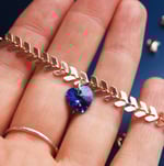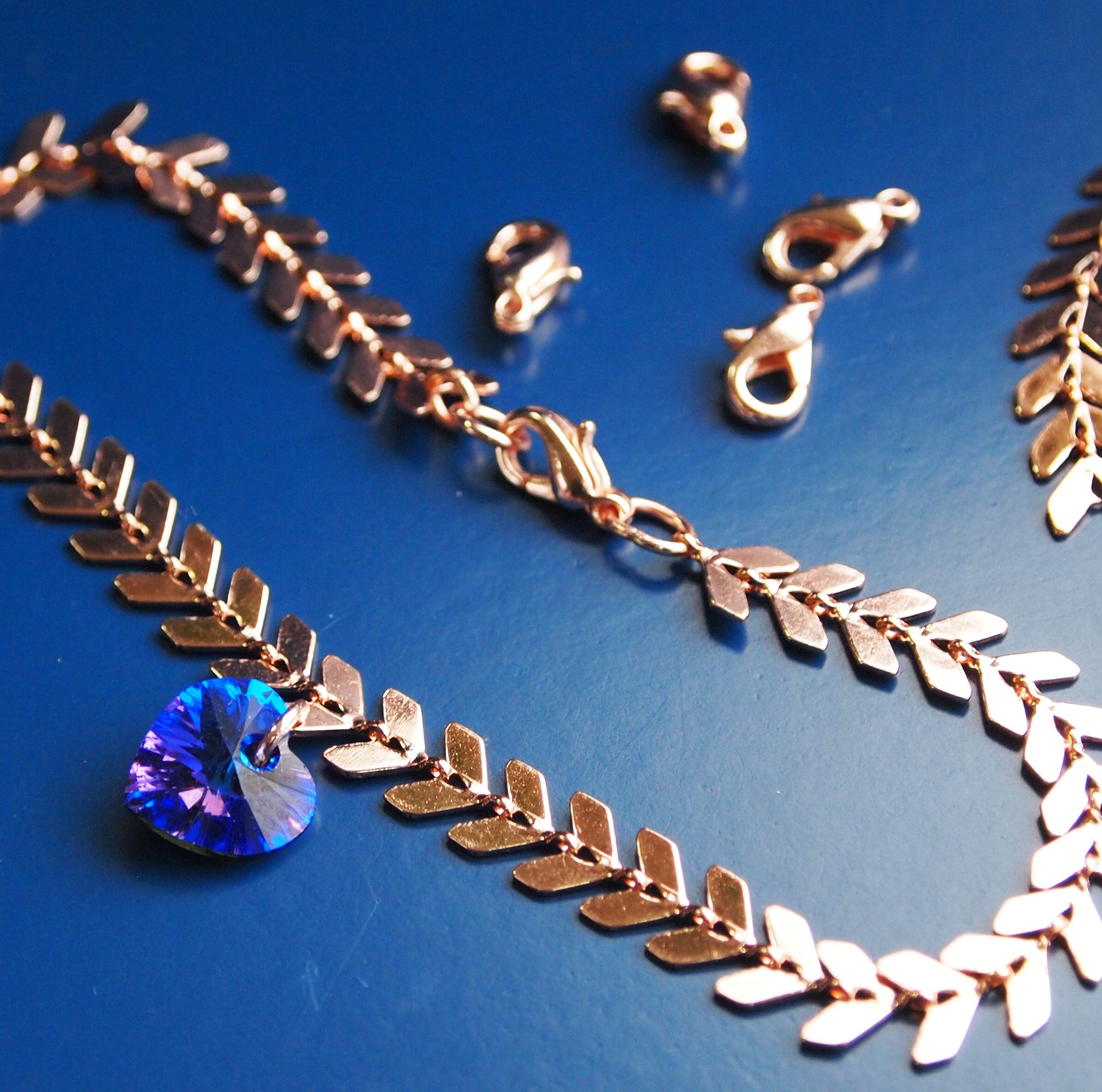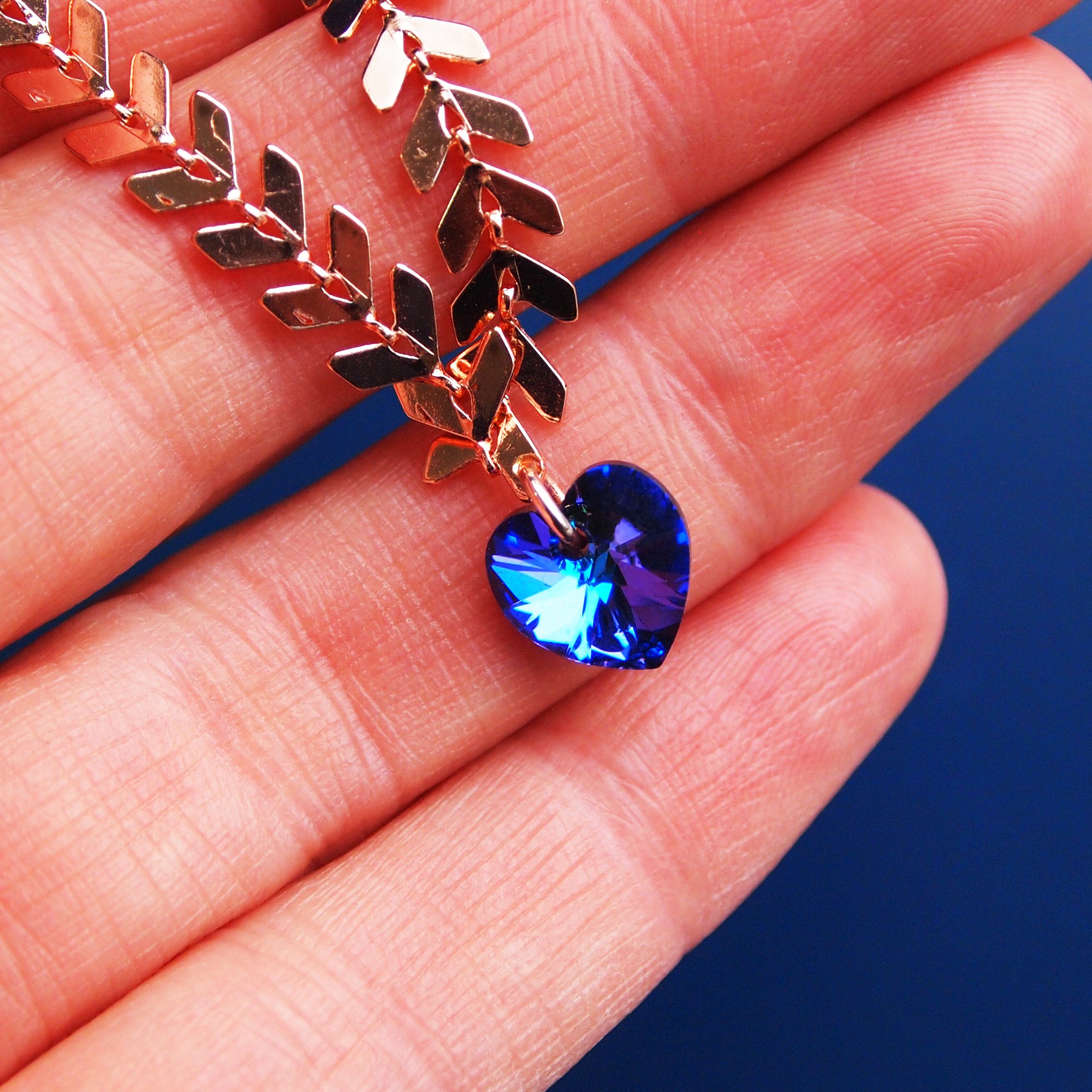 This bracelet features Grecian leaf chain in plated rose gold. It is decorated with a lovely sparkly crystal heart in indigo blue.
