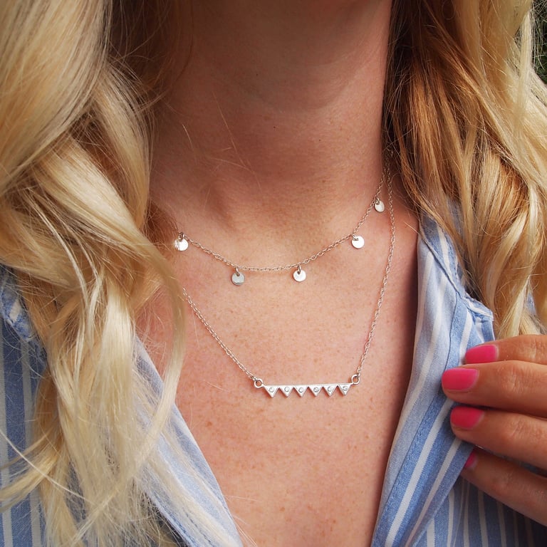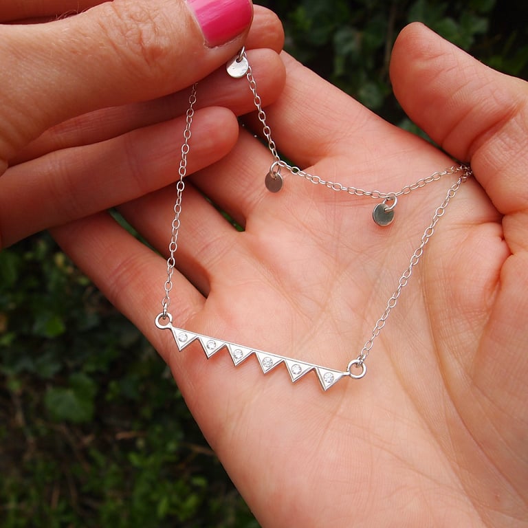 I've set 6 lovely sparkly stones on a solid sterling silver flag style bar. I hand make each component with saws and files making this a truly unique piece of jewellery that will be in your collection for years to come.
