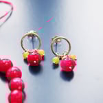 Sterling silver stud hoops decorated with pink jade and lemon lasper beads.