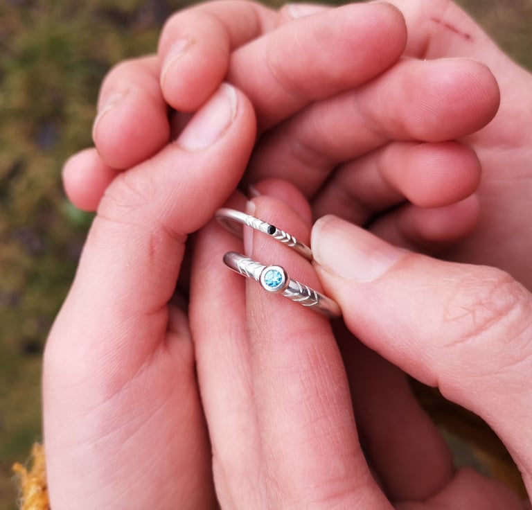 Made from eco silver in scotland, these hand made rings are engraved and set with stunning sparkly gem stones. They are going to be one of your favourite pieces of jewellery that you'll treasure forever.