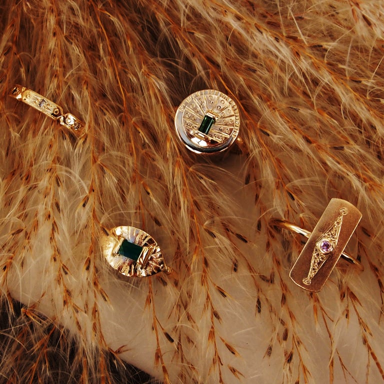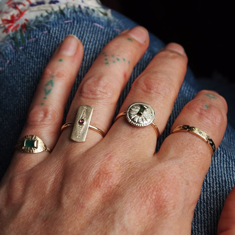 These rings are formed, cut, set and engraved by hand. They have a slightly matt finish which highlights the delicate engravings on the face of the ring. Each piece will be slightly different as they are lovingly formed with hand tools.