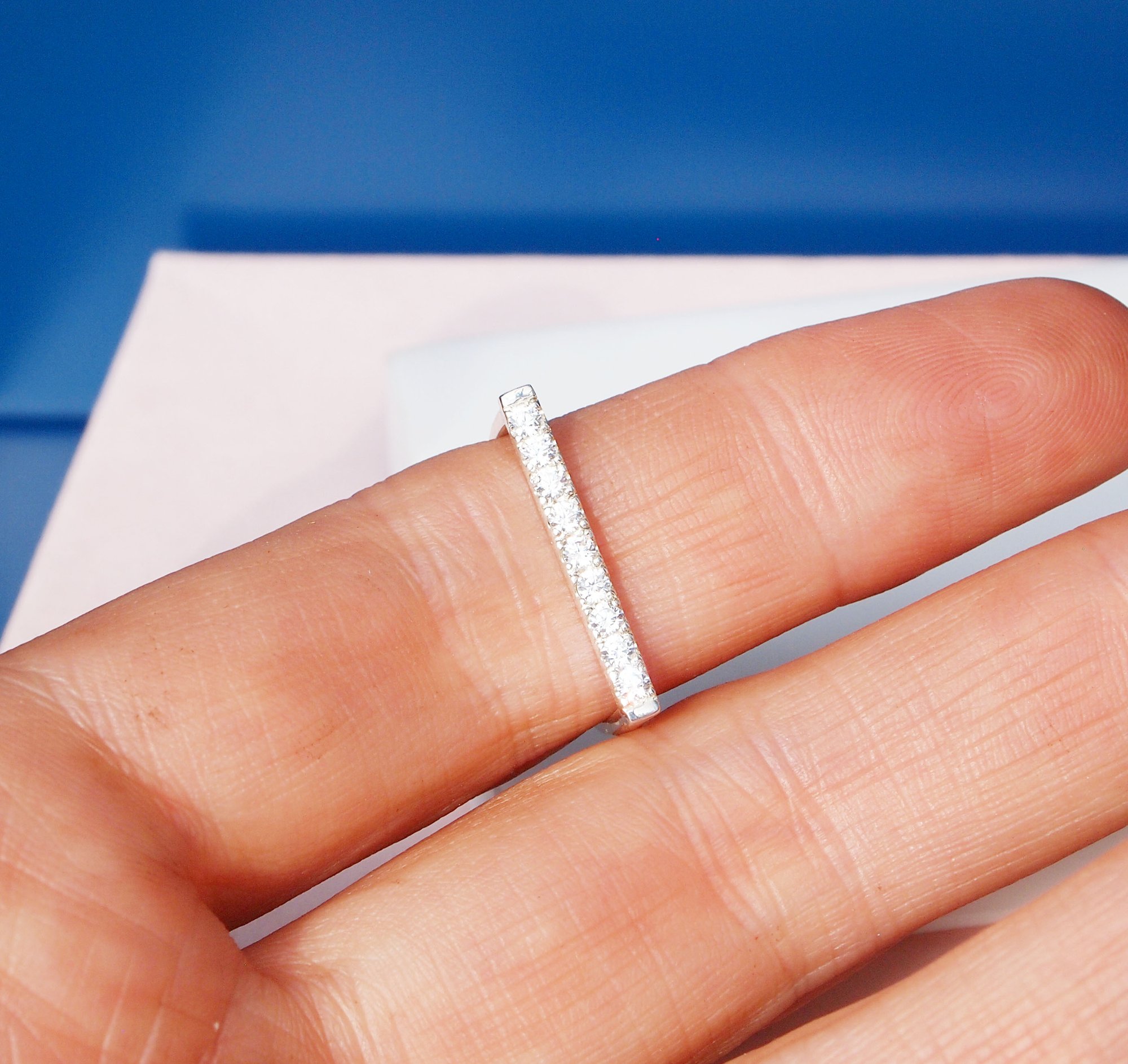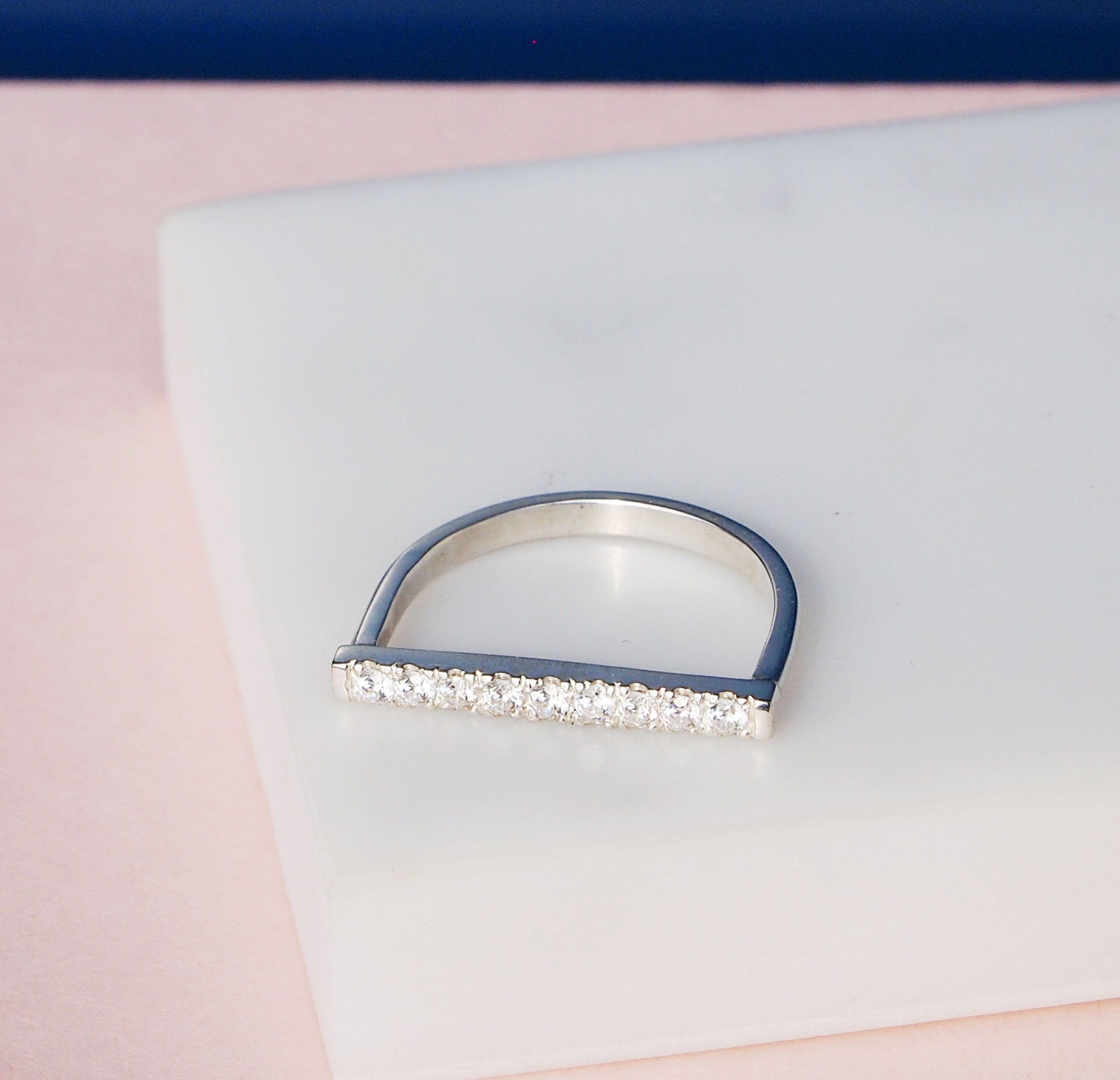 The ring has a U shaped band with a square bar top that is just the sparkliest thing you have ever seen, a great addition to your jewellery collection!