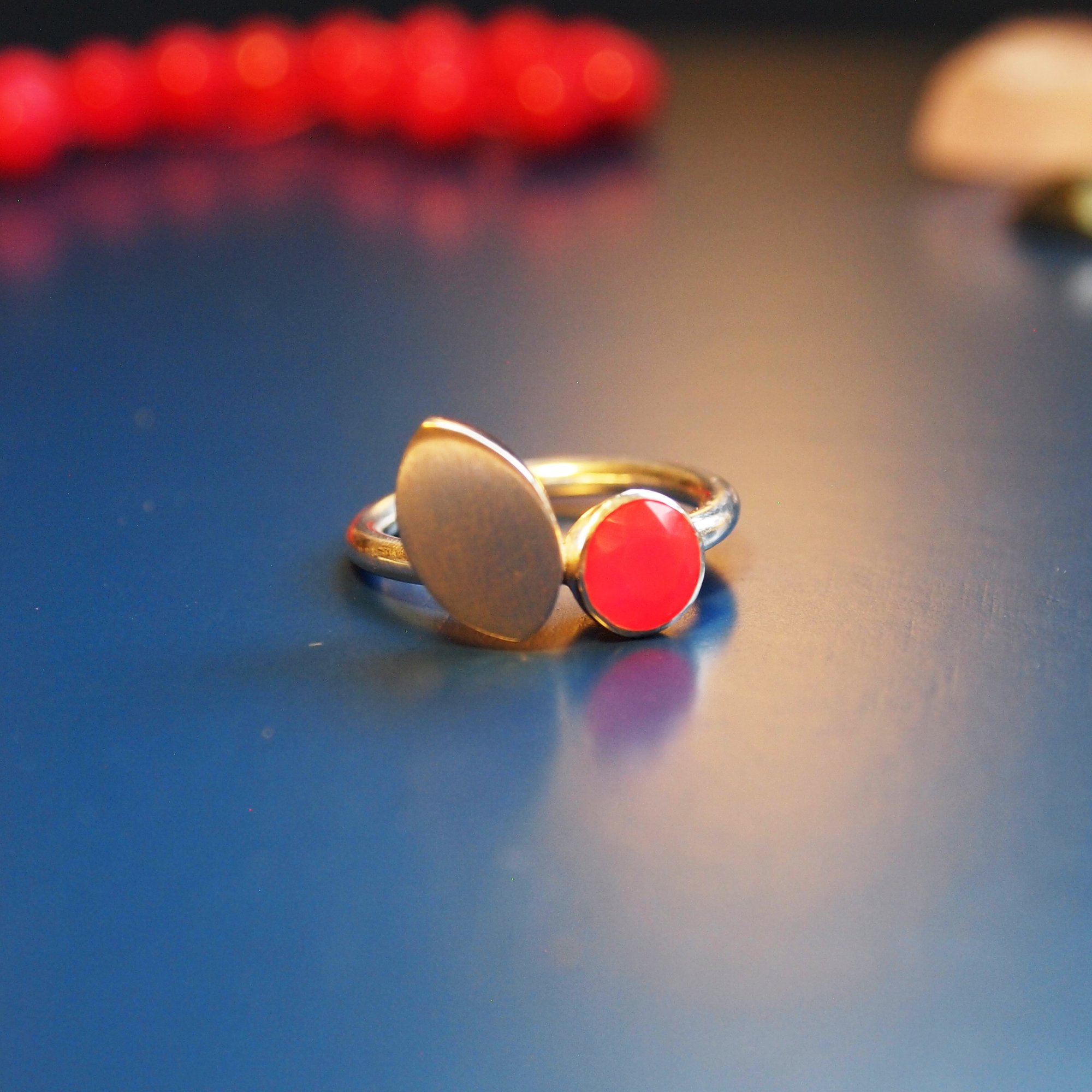 This ring is adorned with the most beautiful coloured pink gawa stone and the most tactile 3D lense shape. It is all hand made in a jewellery workshop just north of dundee.