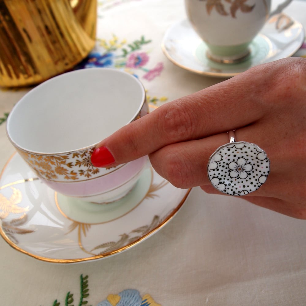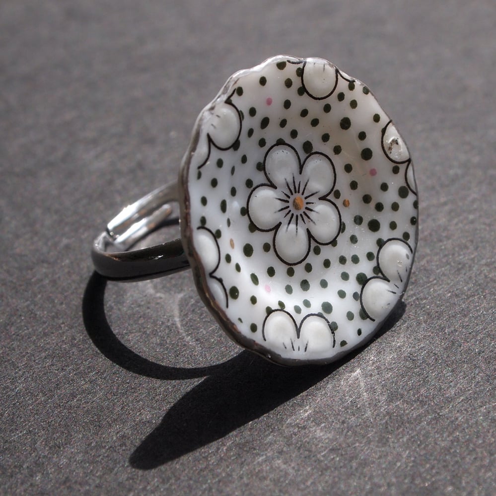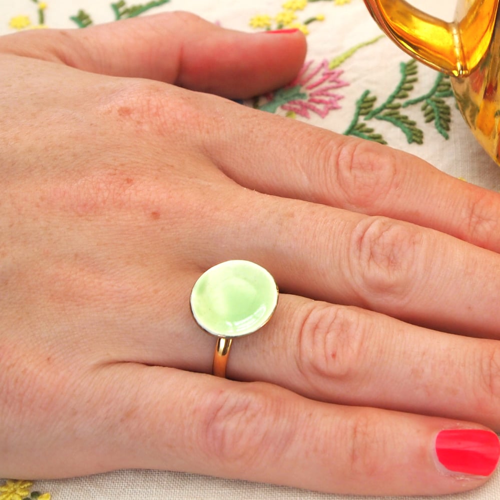 green and gold plate ring or large spotty silver plate ring.