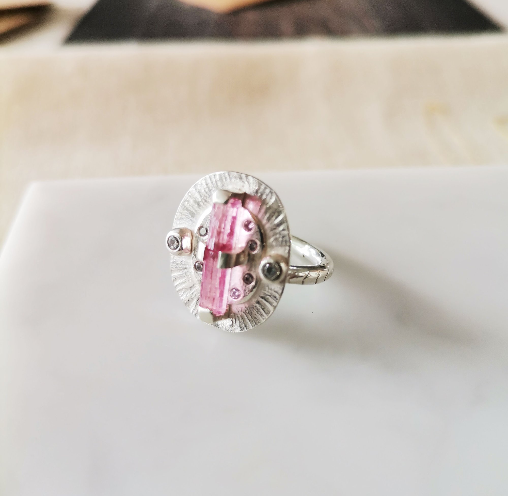 Designed and made in-house from recycled metal and hand set with a one off pink tourmaline crystal.