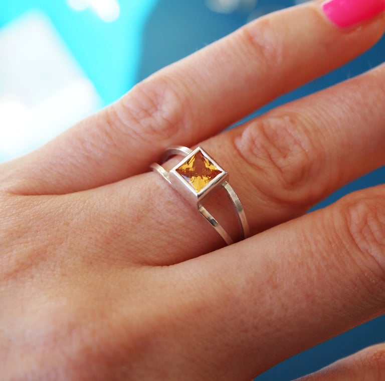 Made from solid sterling silver this amber princess cut stone sits in a square setting with a double square cut ring shank. It is lovely and sparkly and will look great worn with a summery skater dress.